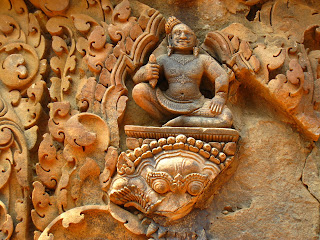 We were another hour in the car - the paved roads here are bouncier than the unpaved ones - to Bantaey Srei. This is a temple MUCH smaller than those we've seen over the past few days. However, it was the most impressive. It is about 200 years older than the others and constructed of rose sandstone which has held the hand carved bas reliefs best over the past 1200 years. Bantaey Srei is commonly referred to as the woman's temple and has gorgeously detailed and meticuolously carved stories of Hindu culture. It was too hot to spend too much time, but we saw it all and Jim got some good photos.